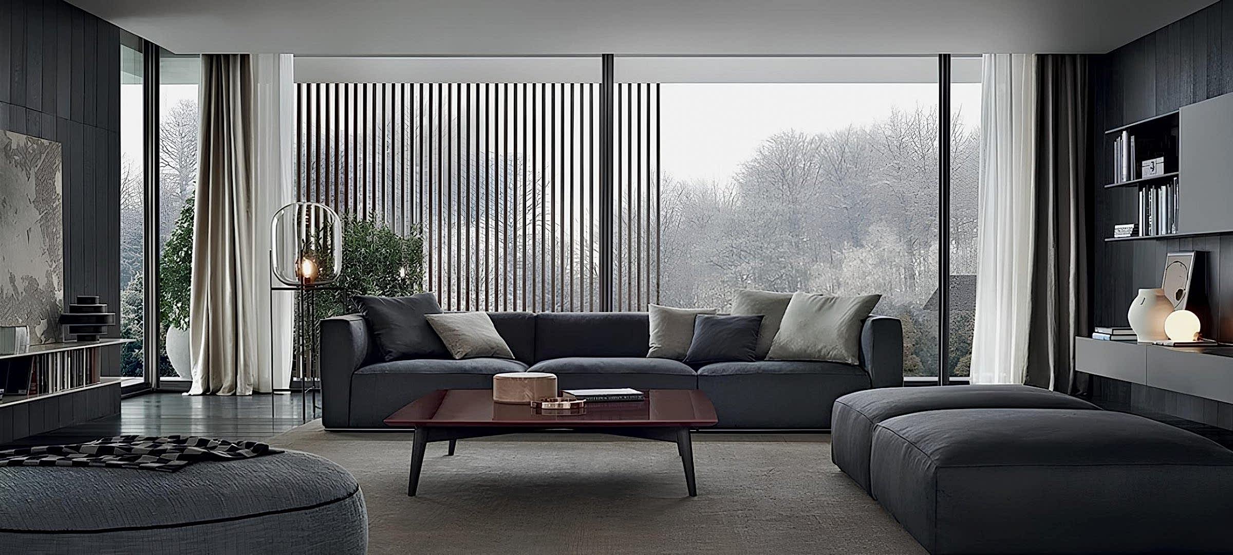 Tasarımın fonksiyonelliği geniş modüllerle sağlanmıştır. Kare formda, geniş puf/sehpa olarak da kullanılabilen modüller, istenildiğinde uzanma alanı veya ek oturma yüzeyi yaratır. Orta sehpanın koyu kırmızımsı ahşap rengi, tüm gri ve siyah tonları arasında sıcak ve çarpıcı bir renk kontrastı oluşturarak odak noktası haline gelir. Arka plandaki dikey ahşap paneller ve büyük cam cephe, mekana mimari bir derinlik katar. Kullanım alanı geniş ve ferah Salonlar olan Shanghai Koltuk Takımı, modüler fonksiyonelliği ve sofistike renk paletiyle modern lüksü arayanlar için idealdir.